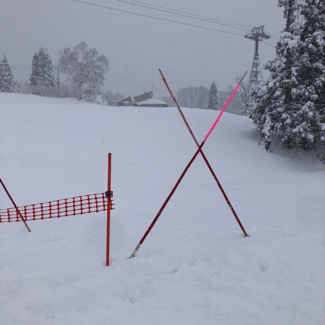 コースではないリフト下・赤色フラッグ・赤色看板・ロープ・バッテン等の先、周辺は進入禁止エリアです。