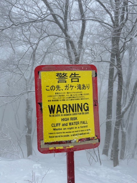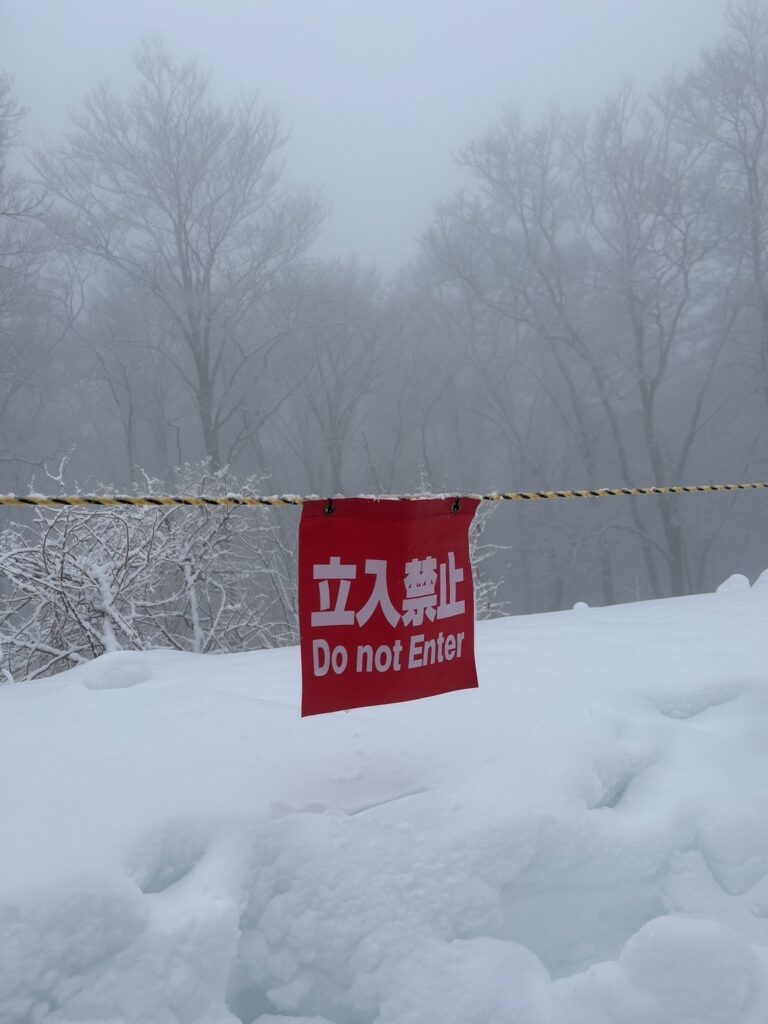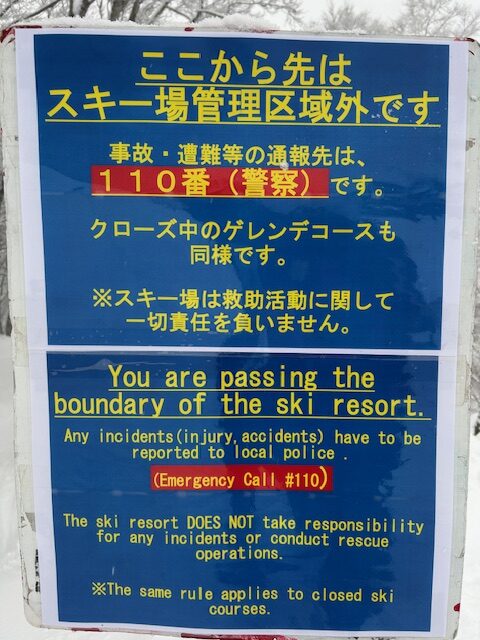 黄色フラッグ・黄色看板はスキー場コース管理区域外です。すべての事故、遭難等は自己責任になります。通常のパトロール業務は行っていません。事故や遭難発生の場合、当事者に相応の費用が発生します。警察、民間機関との連携になり、天候などの状況でいかなる状況だとしてもすぐに救助活動を行えない場合があります。