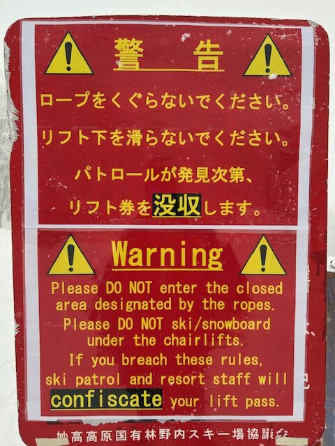 立ち入らないでください。その先には、危険な箇所や他人、周辺に被害をもたらす可能性があったり、もどることが困難な場所に行く可能性があります。進入を発見された場合、警告もしくは、お手持ちのリフト券を没収する場合があります。